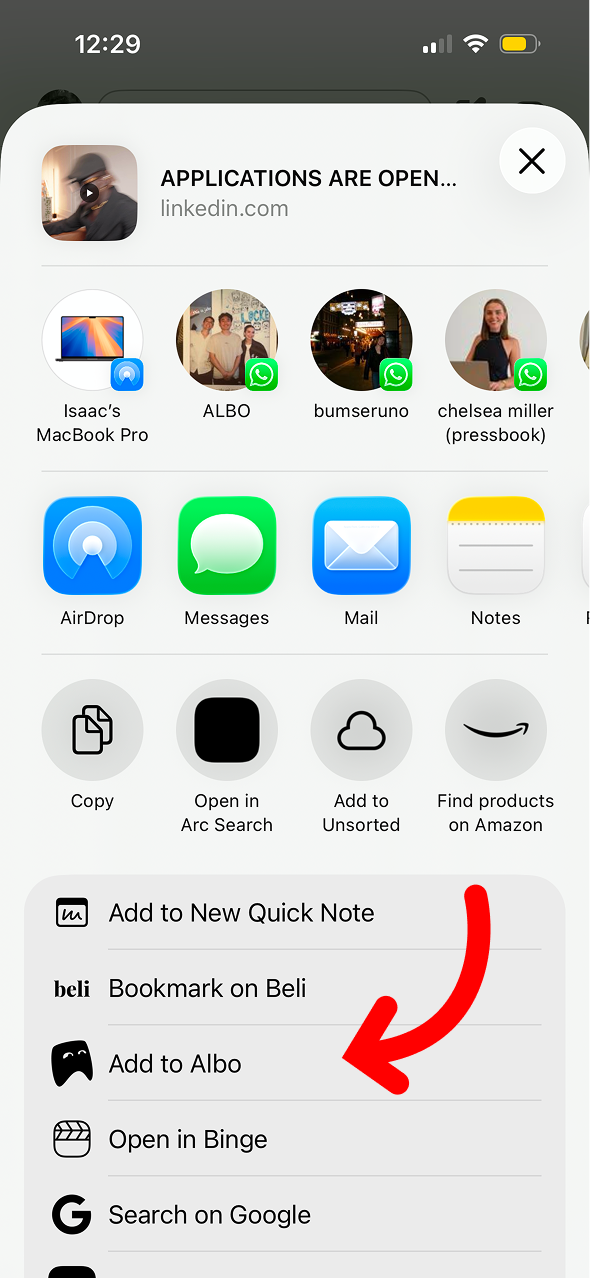 Scroll the share sheet and tap Albo. The post will be saved with its title, content, and any media.